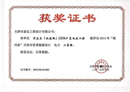 在電力設(shè)計(jì)分公司及相關(guān)部室的精心準(zhǔn)備和不懈努力下,由我公司設(shè)計(jì)完成的“開發(fā)區(qū)(洞庭路)220kV變電站工程”和“濱海站交通樞紐配套市政地下空間工程(首期開工部分)供電系統(tǒng)工程”,分別榮獲天津市勘察設(shè)計(jì)協(xié)會(huì)2015年“海河杯”優(yōu)秀勘察設(shè)計(jì)電力二等獎(jiǎng)和三等獎(jiǎng);此外,公司重點(diǎn)項(xiàng)目“千米橋220kV變電站工程”榮獲國家電網(wǎng)公司2015年度輸變電工程優(yōu)秀設(shè)計(jì)二等獎(jiǎng)。